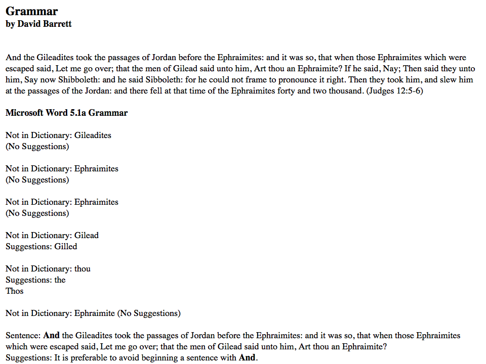 A paragraph of the Old Testament describing a historical genocide (when one ethnic group slayed another that could only be distinguished by the way they pronounced certain words) was passed through Microsoft Word’s grammar and spelling checker to produce recommendations based on US business English.